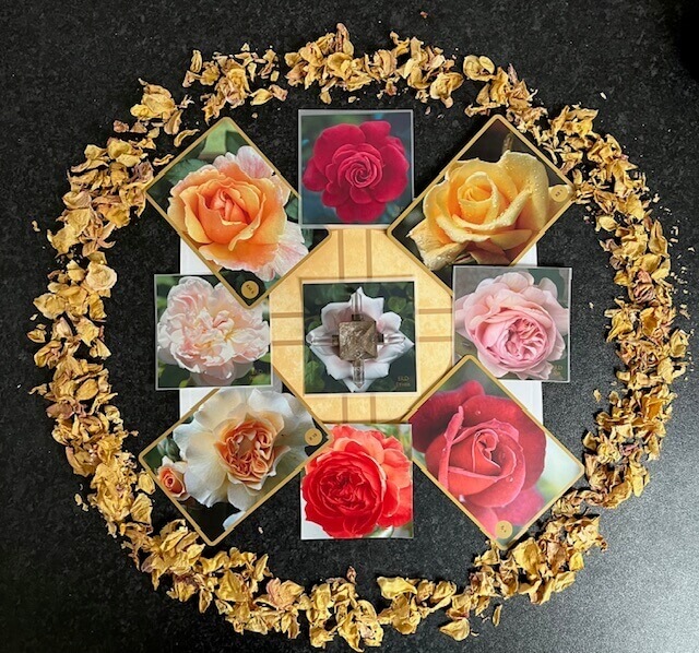 I created a mandala on our land, with plants and flowers from the back garden and Chalice Well, along with some crystals and Chalice Well water. Working remotely, Sandy chose the Roses who wished to work with us. She created a column of light and invited souls who wished to depart, to go towards it. I was tuned in and saw a few arrive, before removing myself to allow them to move on in peace.